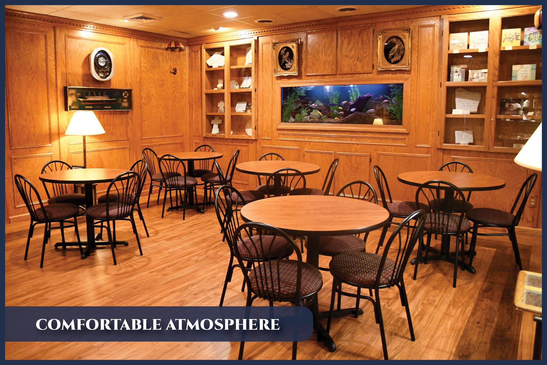 Beautifully decorated lounge area overlooking a tranquil aquarium for times of quiet reflection.